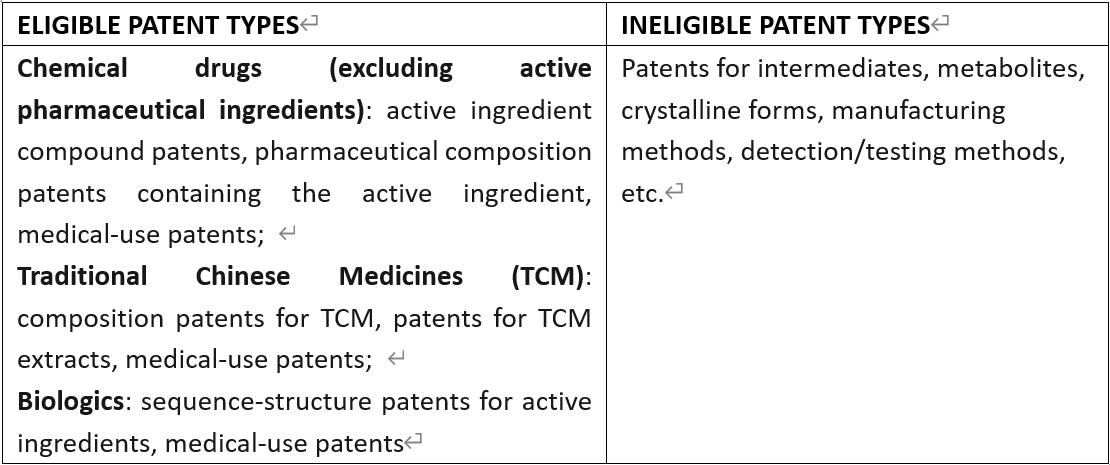 Pursuant to the Measures for the Implementation and relevant Policy Interpretation, the scope of patent types eligible/ineligible for registration is as follows:
