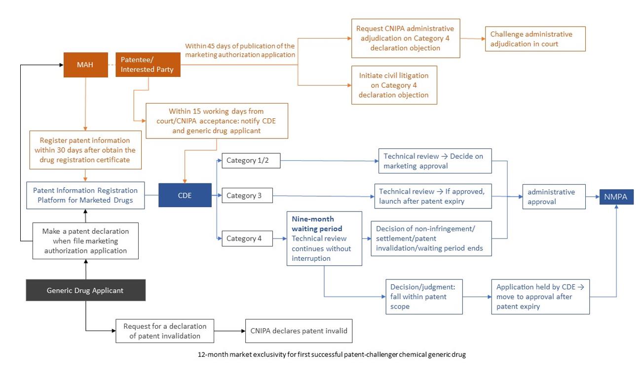 Under this mechanism, when submitting a marketing authorization application, a generic drug applicant must make a formal declaration regarding any relevant patents. If a dispute arises, the patent holder of the original drug or the interested party may, during the review stage, bring a civil lawsuit or apply for an administrative adjudication to determine whether the generic drug falls within the scope of the relevant patent. Pending a court judgment or administrative adjudication decision, the drug regulatory authority may suspend the approval process for the generic drug.