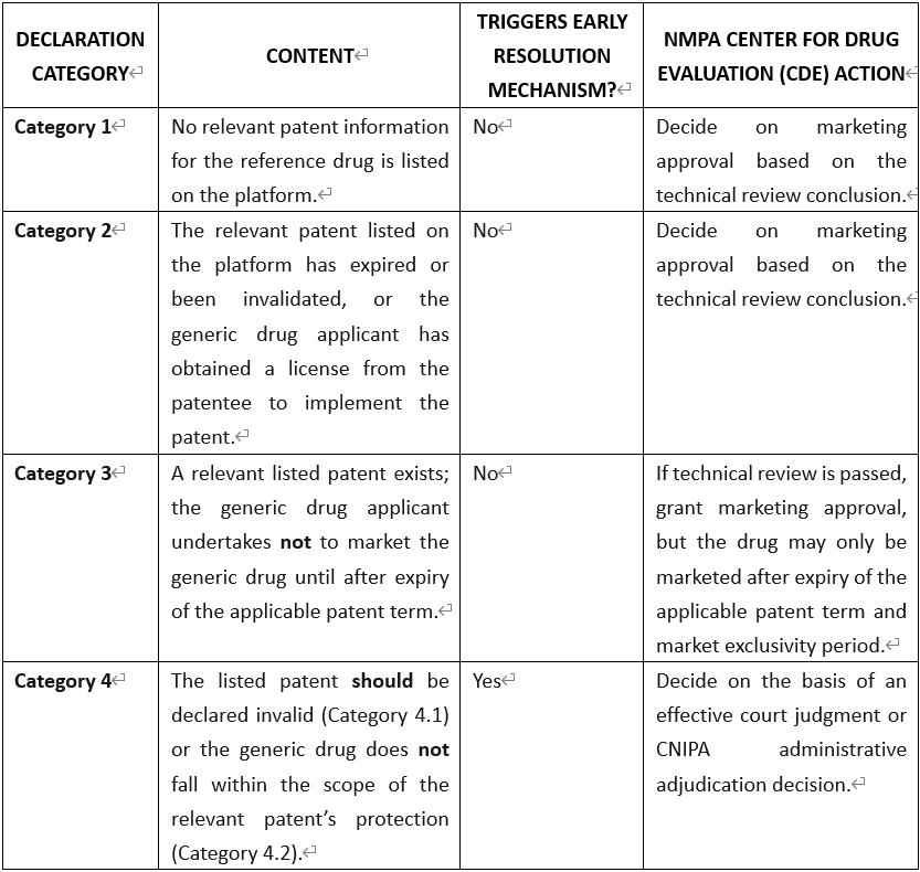 Under this mechanism, when submitting a marketing authorization application, a generic drug applicant must make a formal declaration regarding any relevant patents. If a dispute arises, the patent holder of the original drug or the interested party may, during the review stage, bring a civil lawsuit or apply for an administrative adjudication to determine whether the generic drug falls within the scope of the relevant patent. Pending a court judgment or administrative adjudication decision, the drug regulatory authority may suspend the approval process for the generic drug.